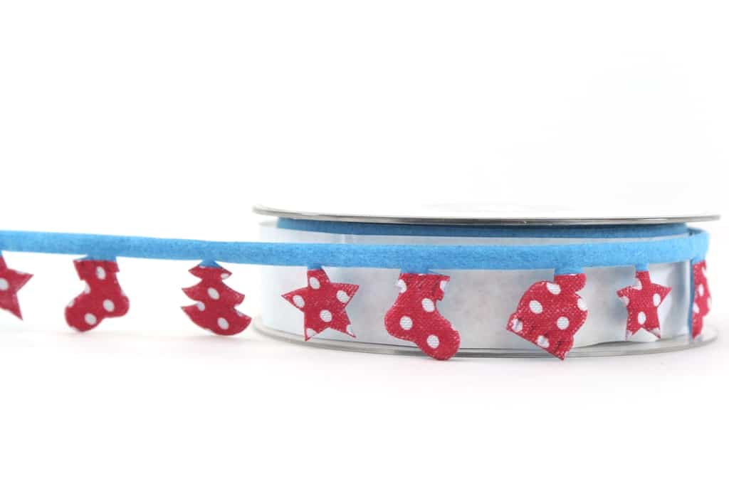 A wonderful article for crafting and decorating. Small punched out boots, fir trees and stars dangle on a light blue felt band.