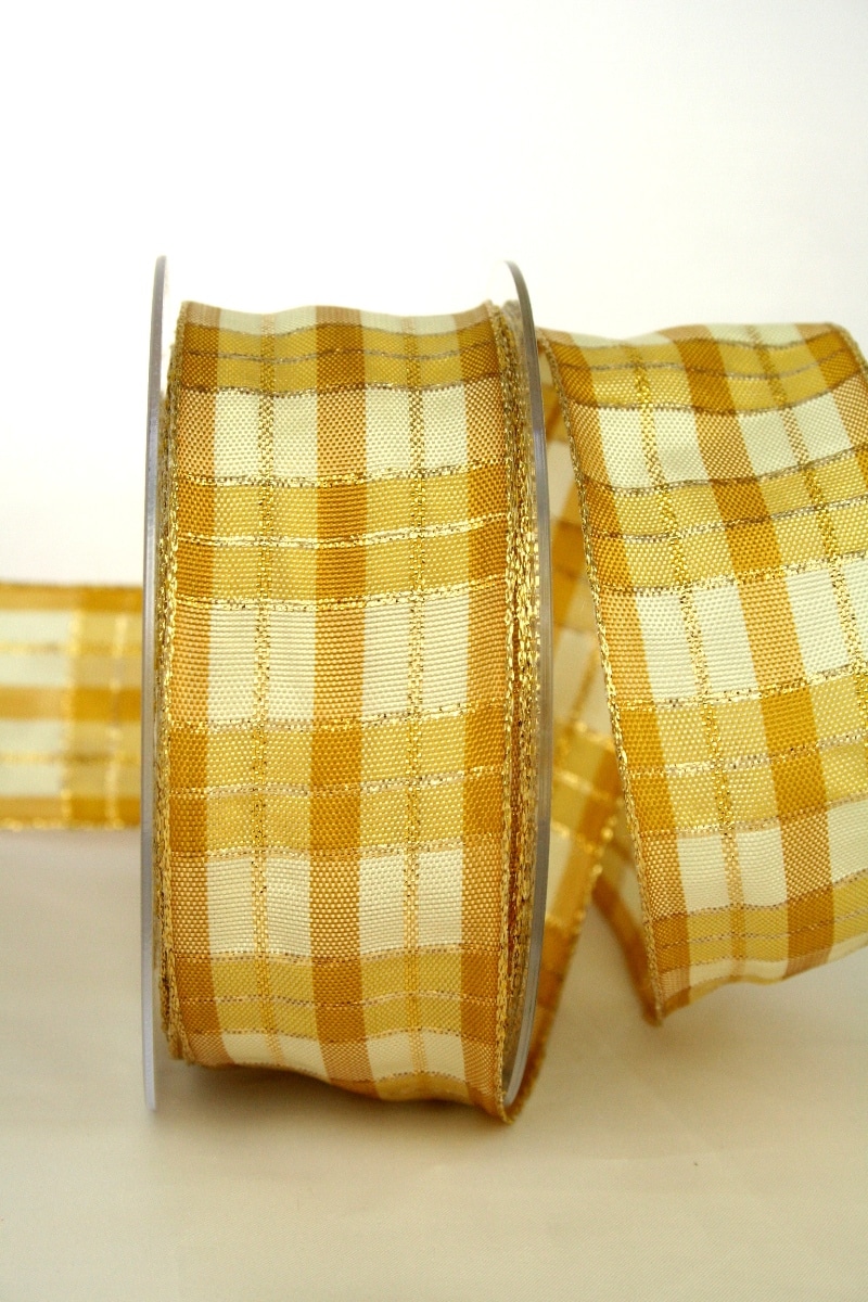 Beautiful cream-gold checked ribbon. 40 mm wide and with wire edge.