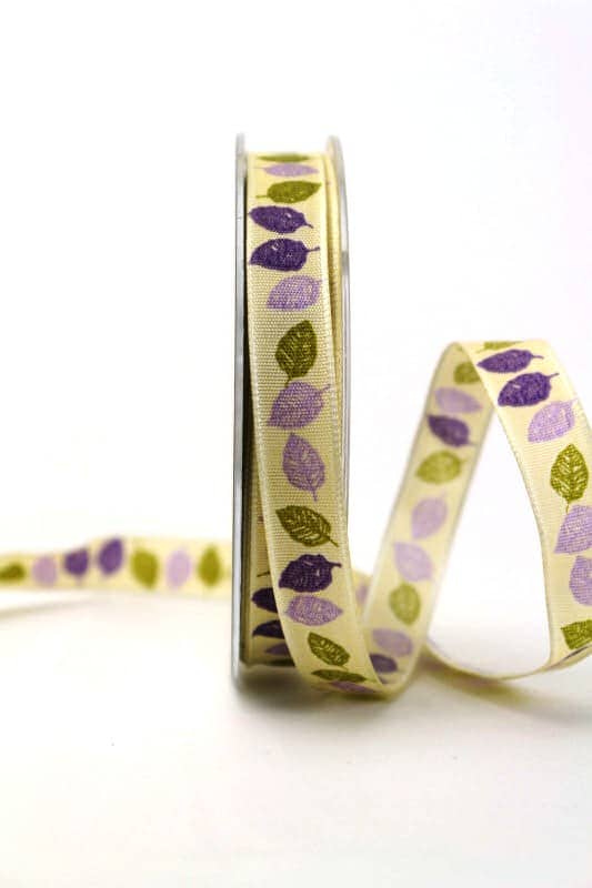 Ribbon with autumn leaves, green-purple, 15 mm, 20 m roll