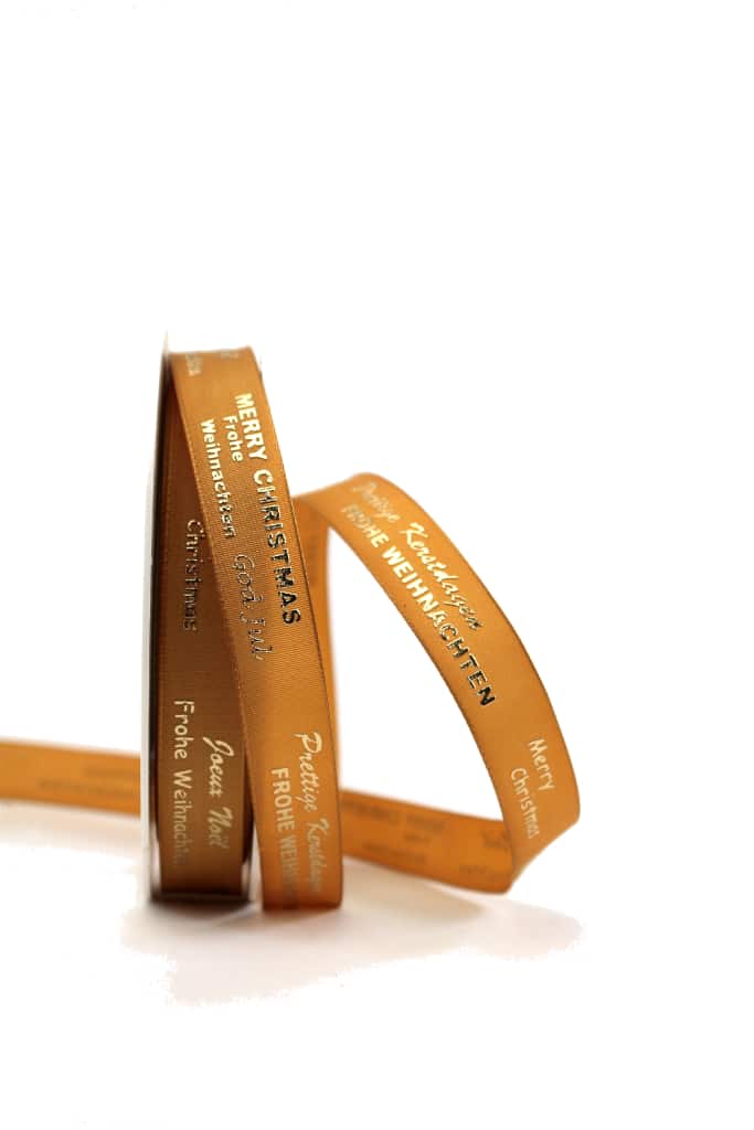 The ribbon is multilingual printed with the following Christmas greetings:
