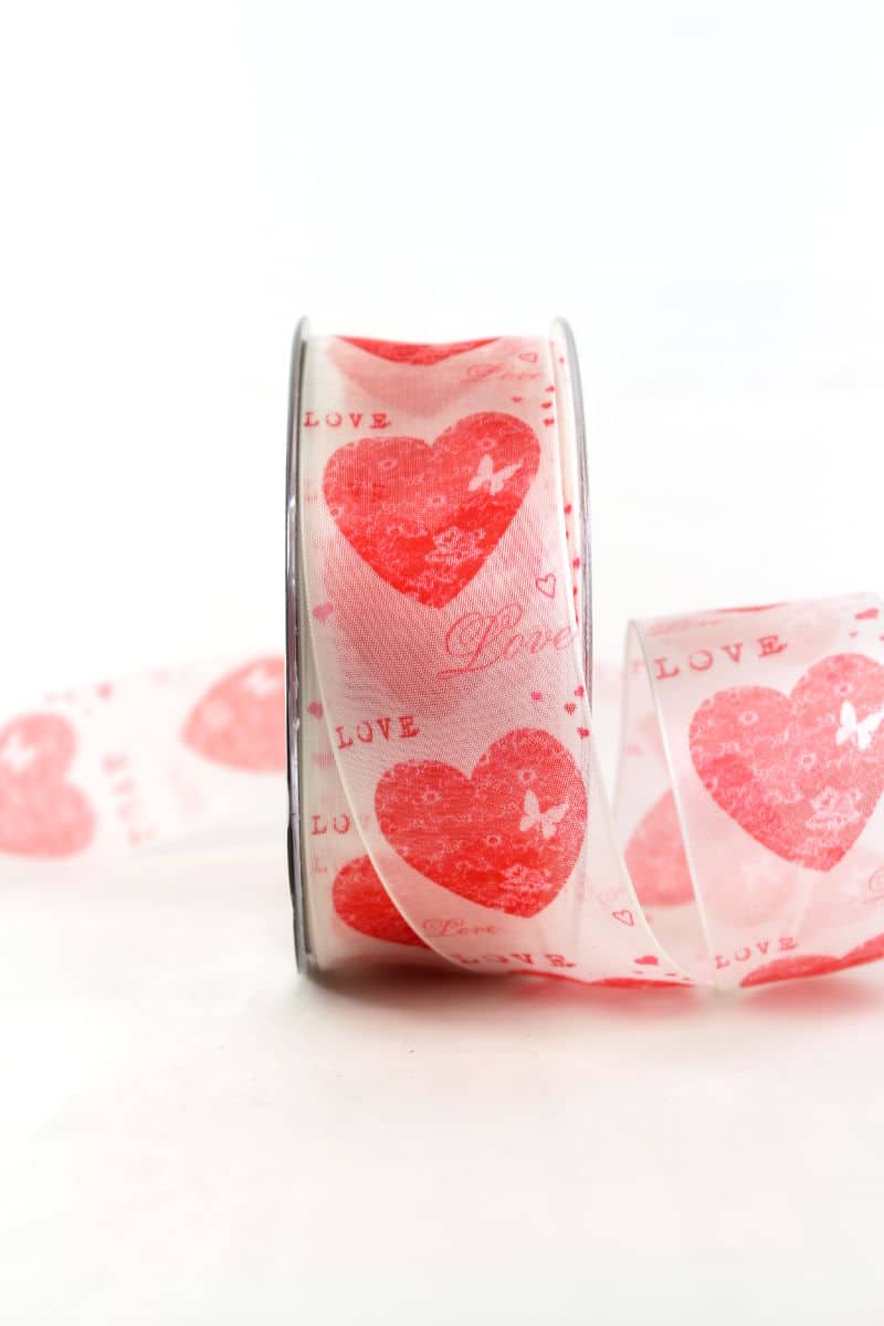 Decorative ribbon with hearts, red, 40 mm, 20 m
