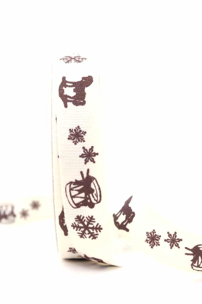 Coarsely woven linen-look ribbon with a childlike print: rocking horse, drum and snowflakes.