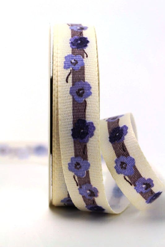Linen ribbon with lilac flowers, 25 mm, 20 m roll