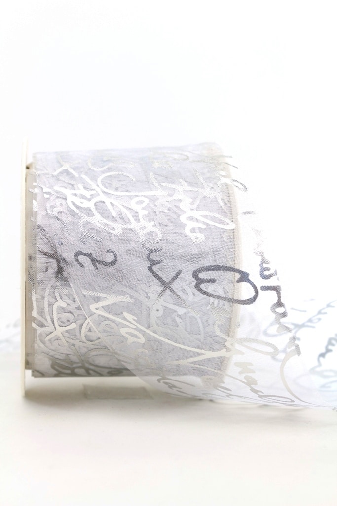Almost completely transparent, white organza ribbon with shiny silver writing. They are the Christmas greetings in different languages.