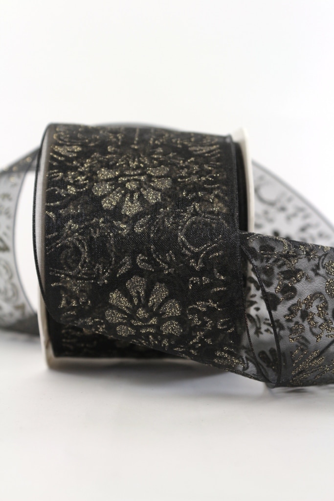 organza ribbon with glitter ornament, black, 70 mm wide, 10 m roll