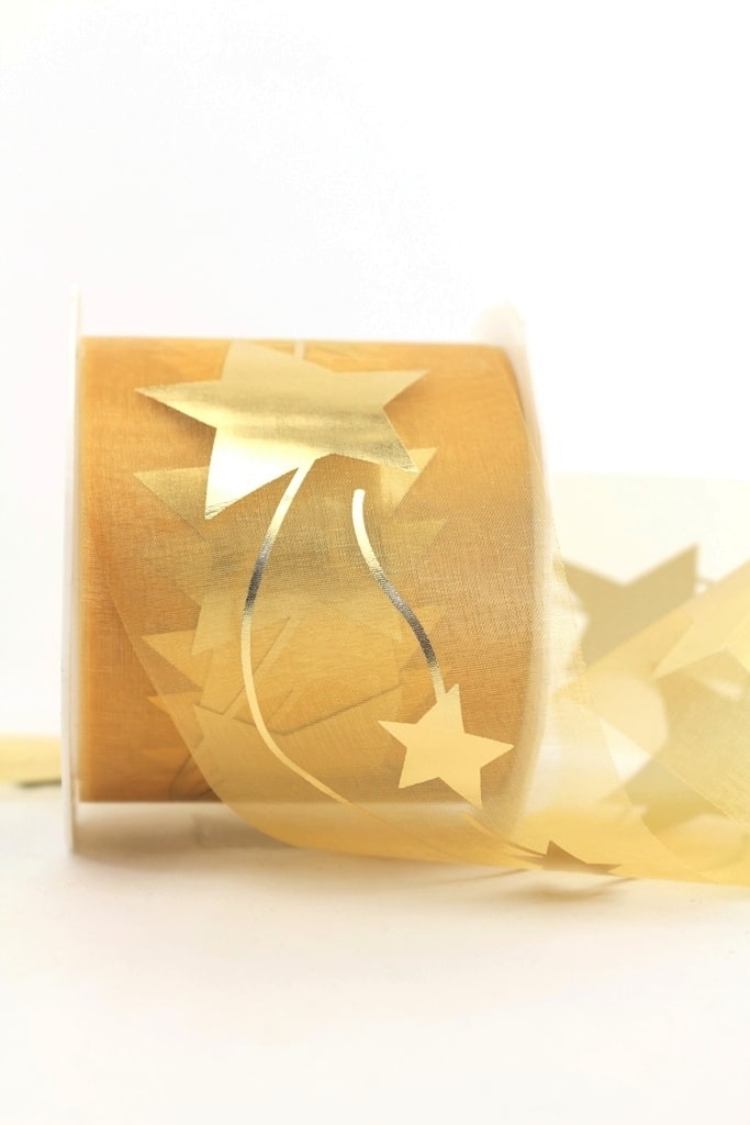 organza ribbon with stars, gold, 70 mm wide, 10 m roll