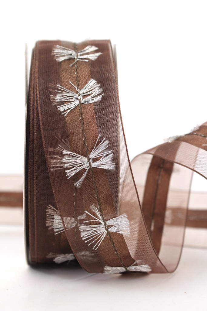 organza ribbon with silver fringes, brown, 40 mm, 20 m roll