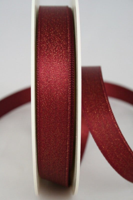 Satin ribbon bordeaux-gold glittering, 15 mm wide, 25 m roll