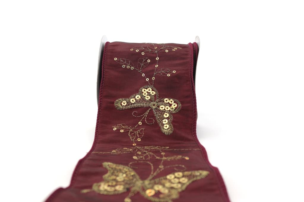 A gift and decoration ribbon for those special moments. A heavy, bordeaux-black iridescent fabric with elaborately embroidered butterflies and sequins in 100 mm width.